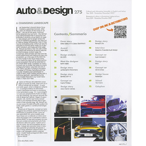 アストンマーティン、ルノー、MG、フォルクスワーゲンといったブランドの進化も交錯し、イタルデザインの未来戦略、ポリミの学生たちの都市モビリティ研究まで網羅。 グローバルな視点と新しいデザイン倫理が交差する、密度の高い275号。